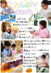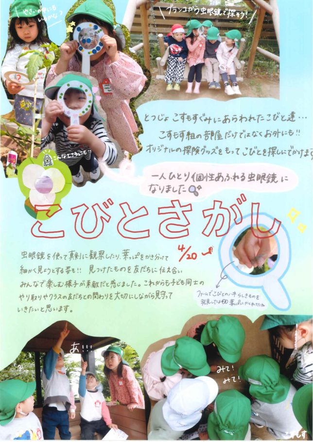 虫めがね 2026年4月24日 虫めがねを使って、こびとさがしを楽しんでいる年中児 新しい環境にも慣れて、遊びも一段と面白くなってきました。 年少児は「たんぽあそび」という絵の具との触れ合いに夢中です。