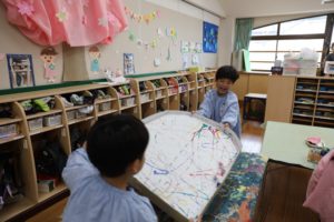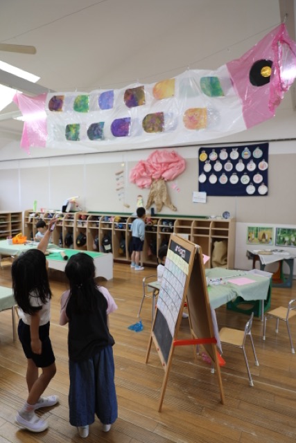 年長さんのお部屋に大きなこいのぼりが泳いでいます。