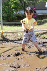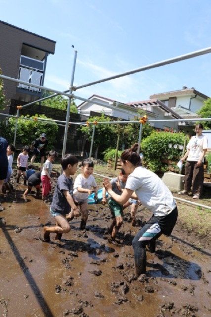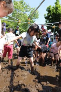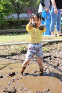 子どもたちが田植え前に土を柔らかくするお仕事を、子どもたちが泥に触れながら行います。